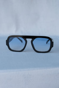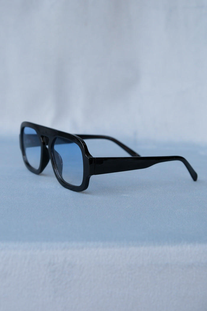 Veda thick squared off, aviator sunglasses with black frames and matching blue lens.