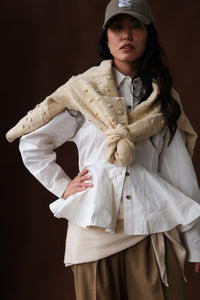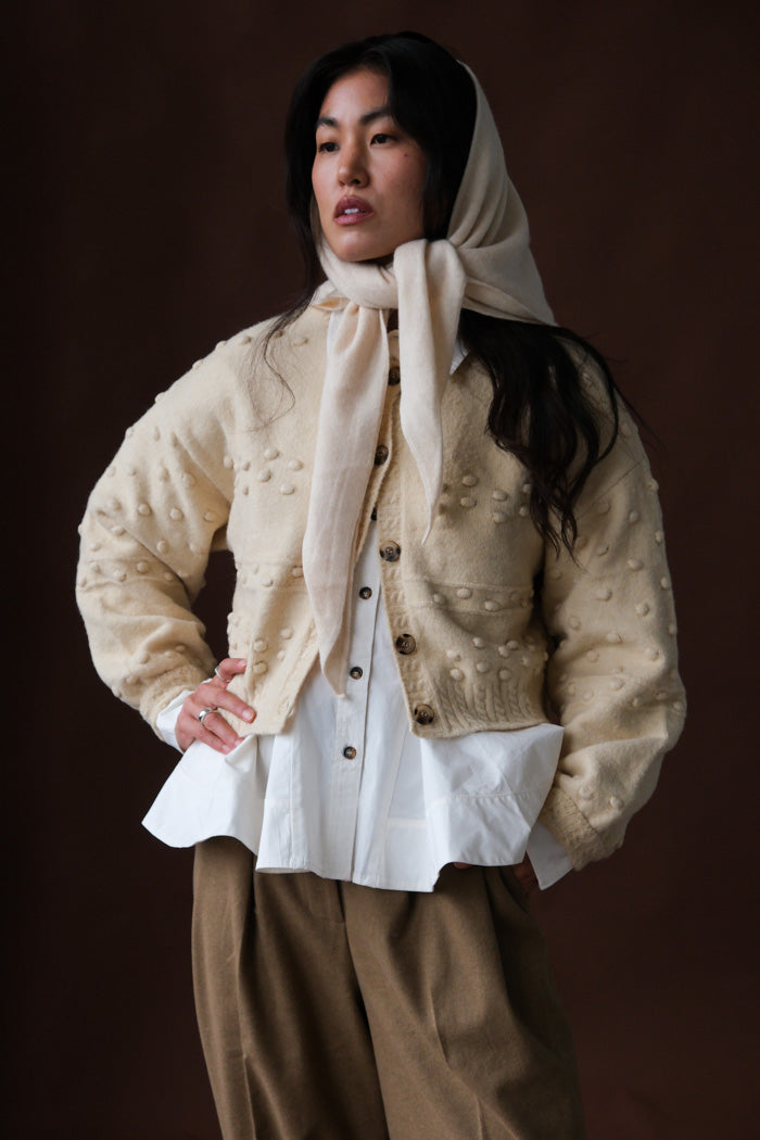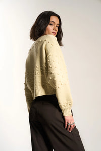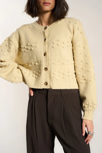 Callahan Jolie cardigan in swan cream. Snuggle up in this fuzzy cardigan with pom-pom details for that perfect mix of playful and cozy. With functional buttons and a relaxed fit, it’s a fall wardrobe must-have.