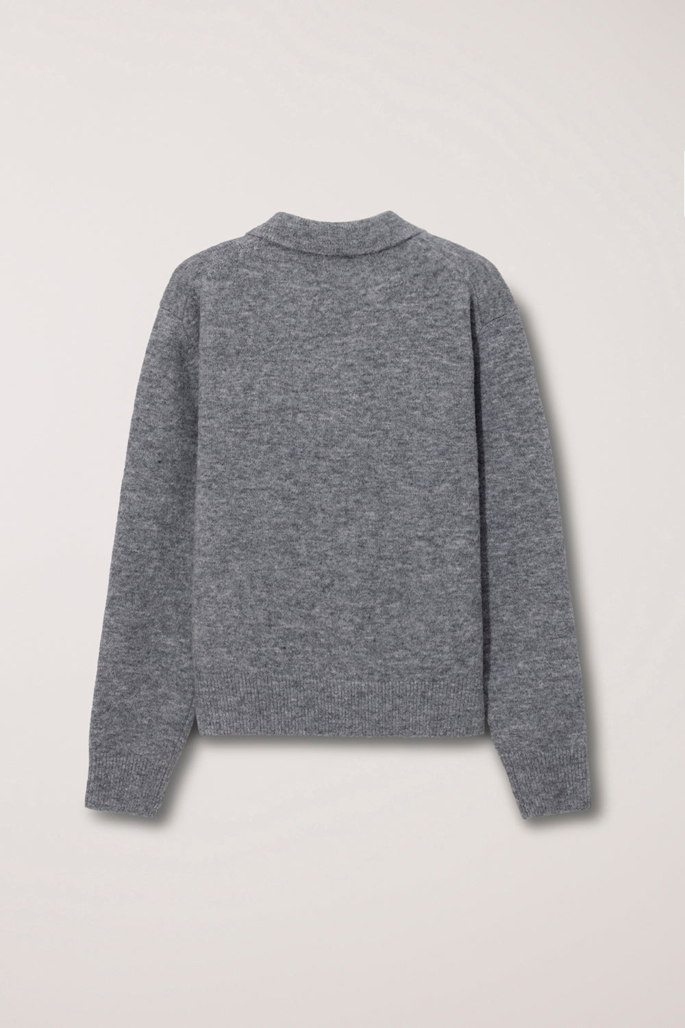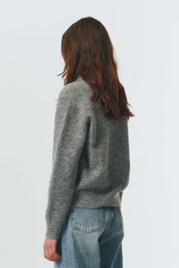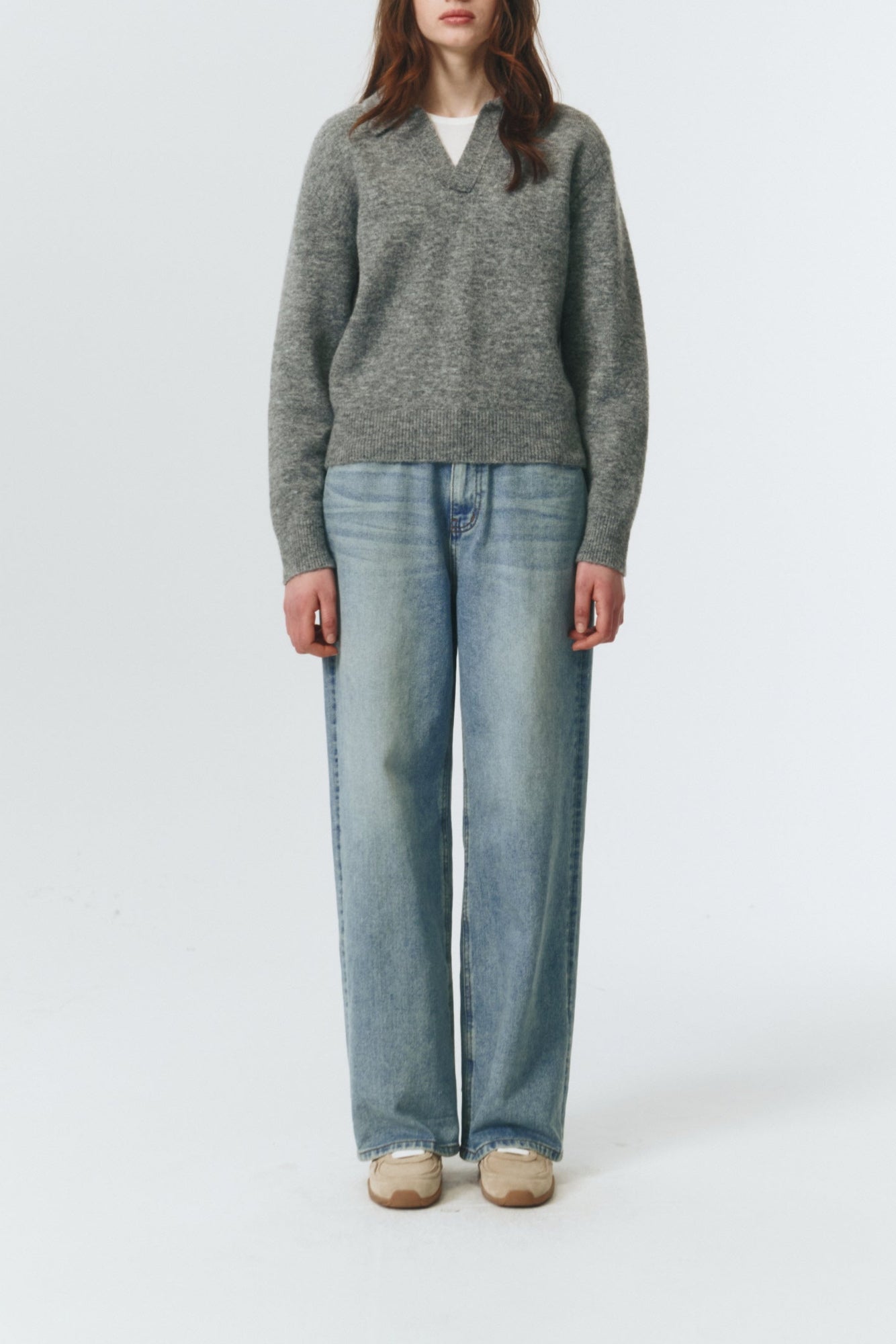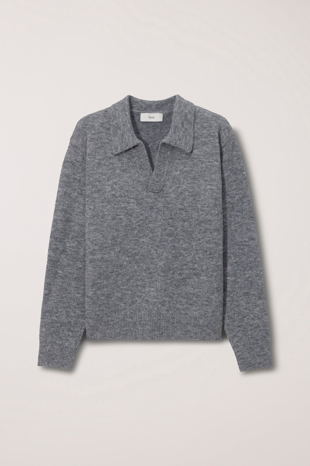 Dunst lightweight brushed alpaca, wool blend unisex open collared v-neck knit sweater in melange grey.