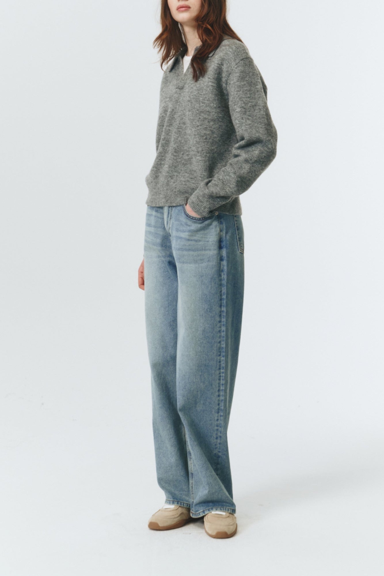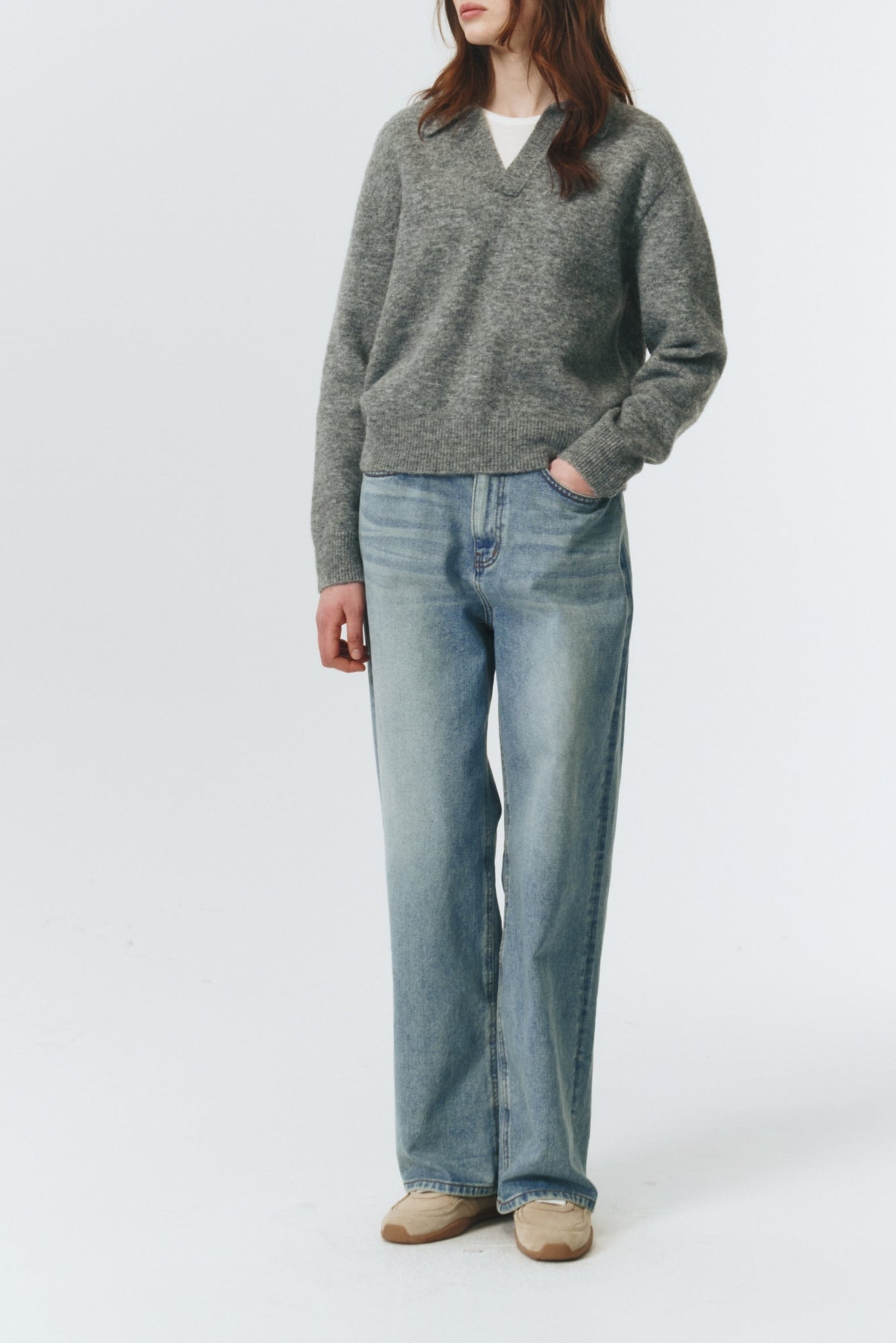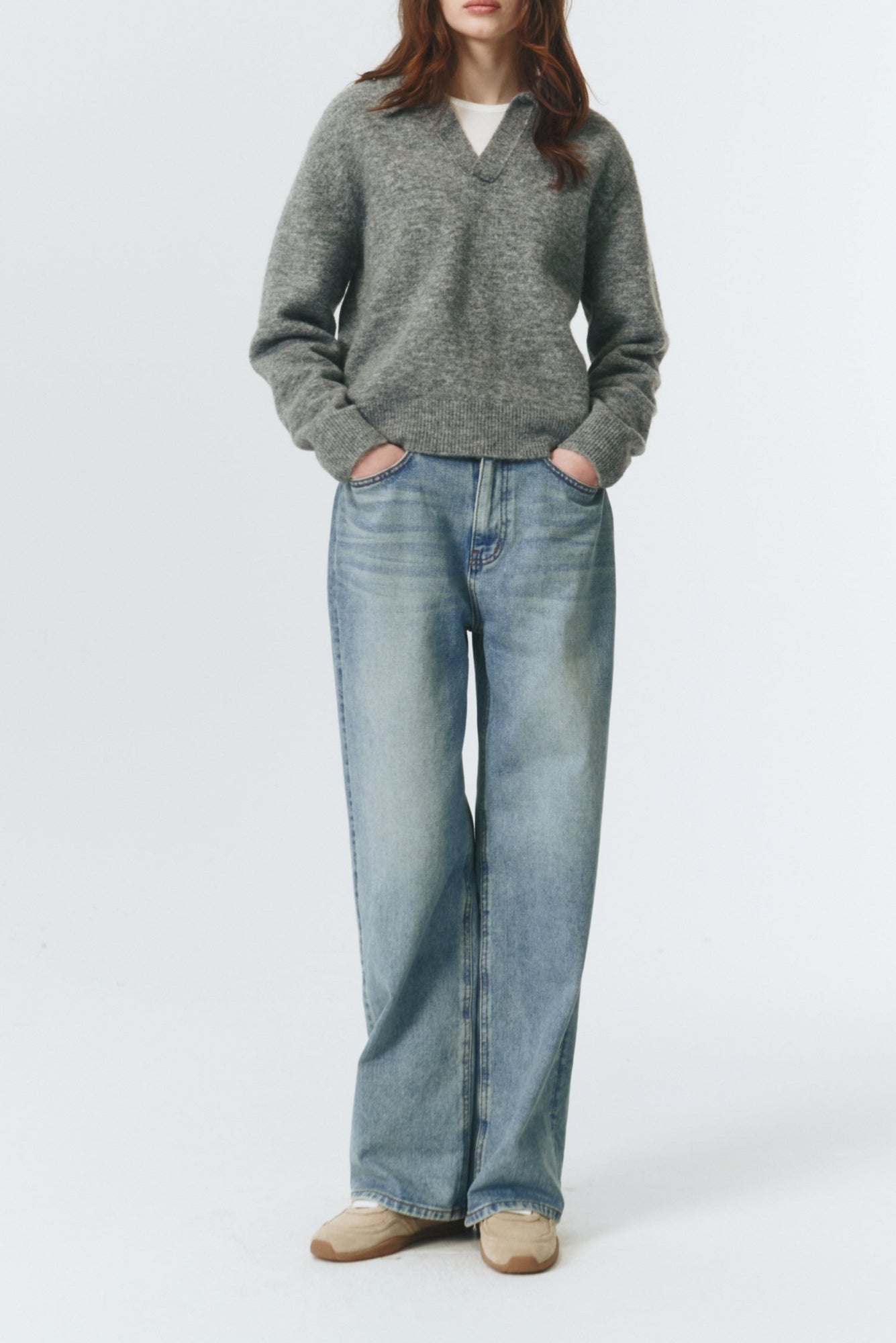Dunst lightweight brushed alpaca, wool blend unisex open collared v-neck knit sweater in melange grey.