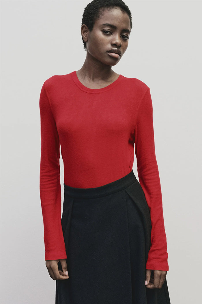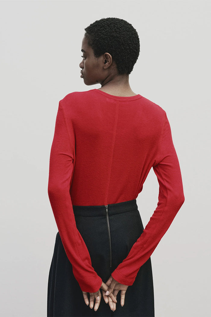 Mijeong Park wool tencel crew neck knit top in red. Lightweight stretch knit fabric.