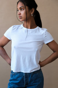 Asher Noe baby tee in white. Intentionally shrunken baby fit. Feather weight Japanese cotton jersey creates a lightweight yet durable "pill-resistant surface" that stays looking fresh wash after wash.