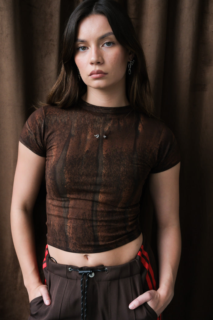 KkCo organic jersey cotton baby tee in mineral dye mud brown with eyelet barbell piercing detail.