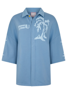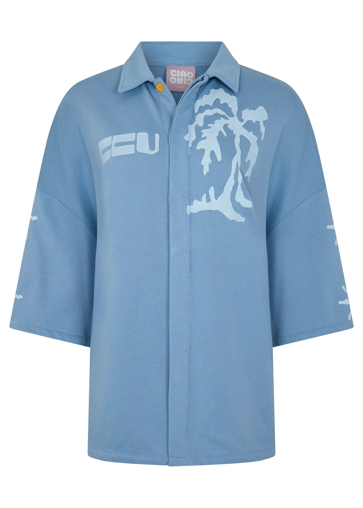 Ciao Ciao Palm Bungalow oversized button up shirt in blue. Cut from soft, washed cotton jersey in a dreamy cloud-blue hue. Hand-drawn island artwork drifts across the body and sleeves. Pair with the matching Palm shorts for a full set.