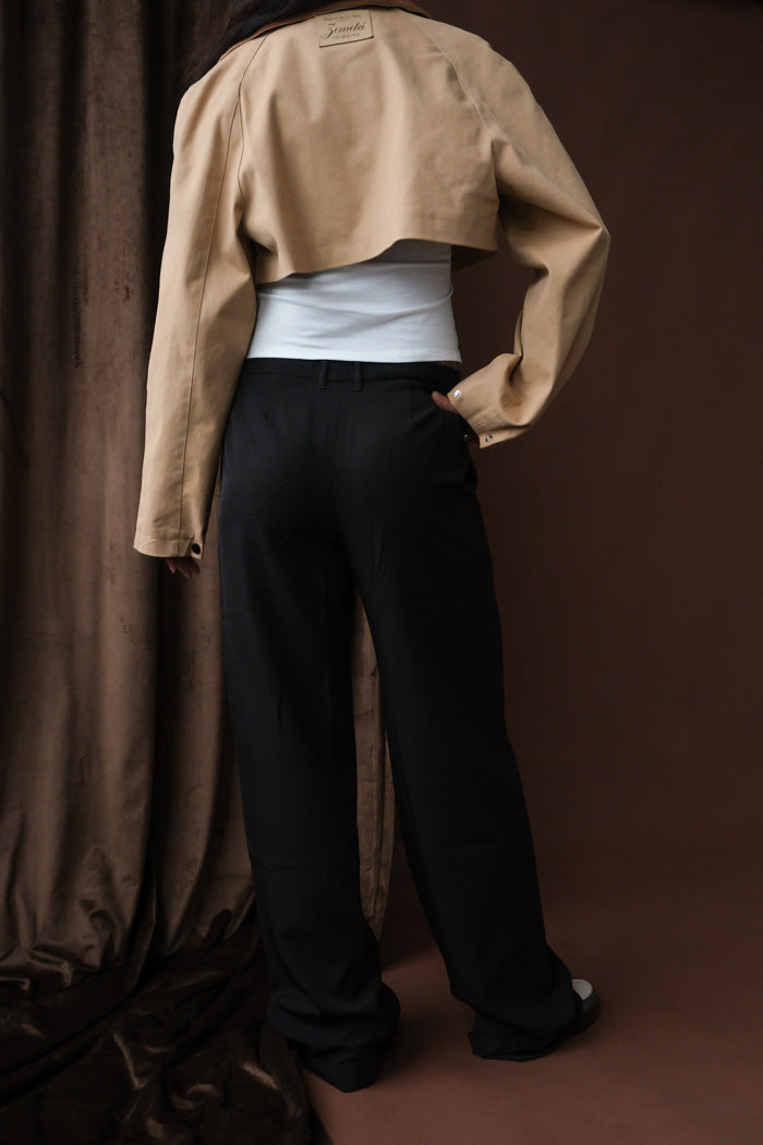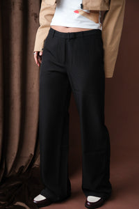 Geel black, low waisted, oversized Kennedy trousers with an overlay waistband closure.