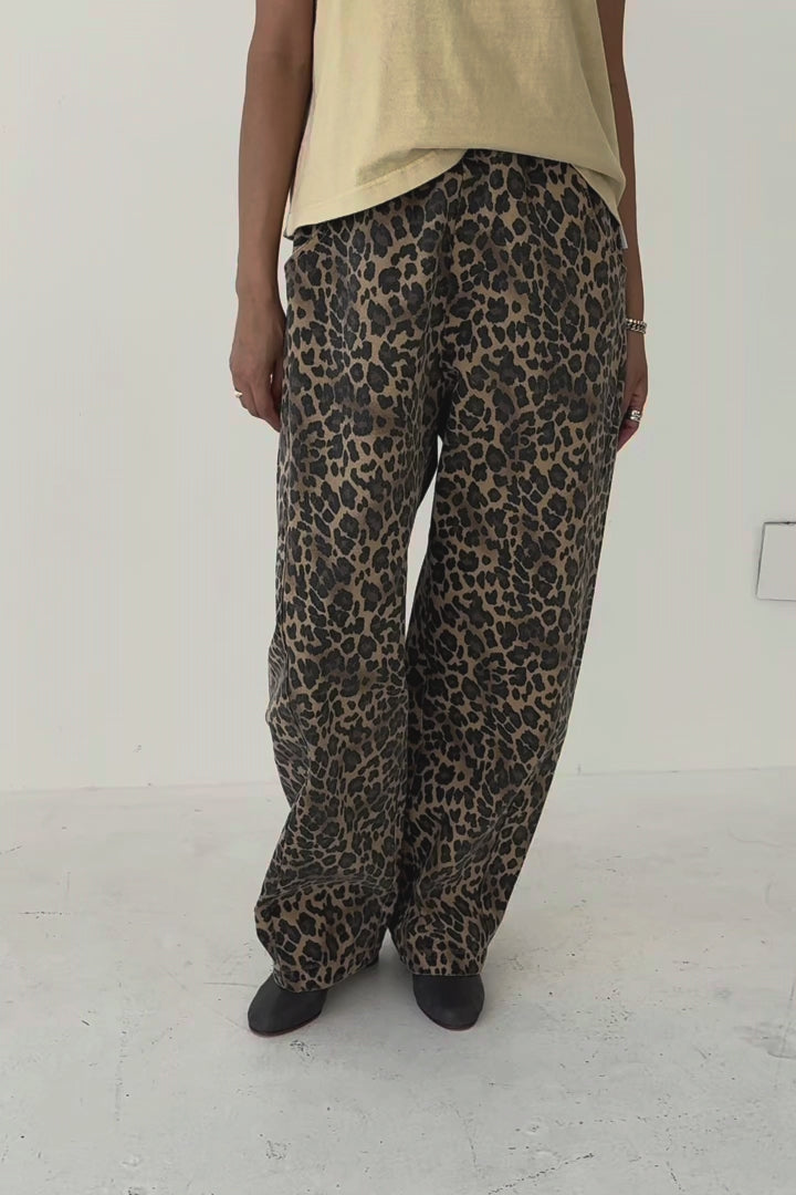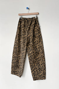 Le Bon Shoppe arc pants long in leopard print. An elastic waist tops a slightly curved leg with a unique arced side seam and panels, along with side pockets.