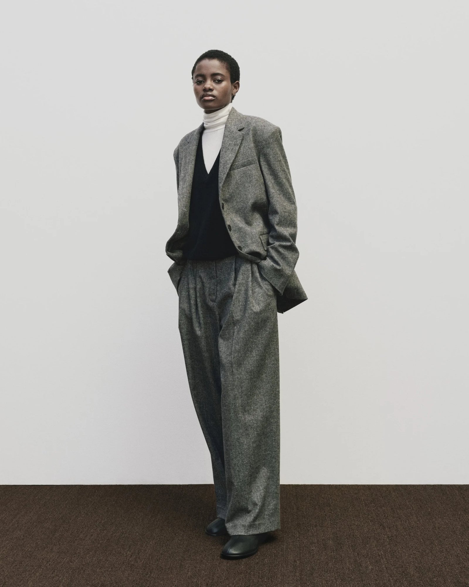 5% cashmere, 60% merino wool, 35% nylon. Dry clean.