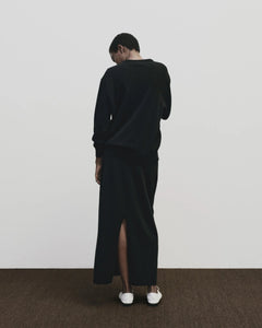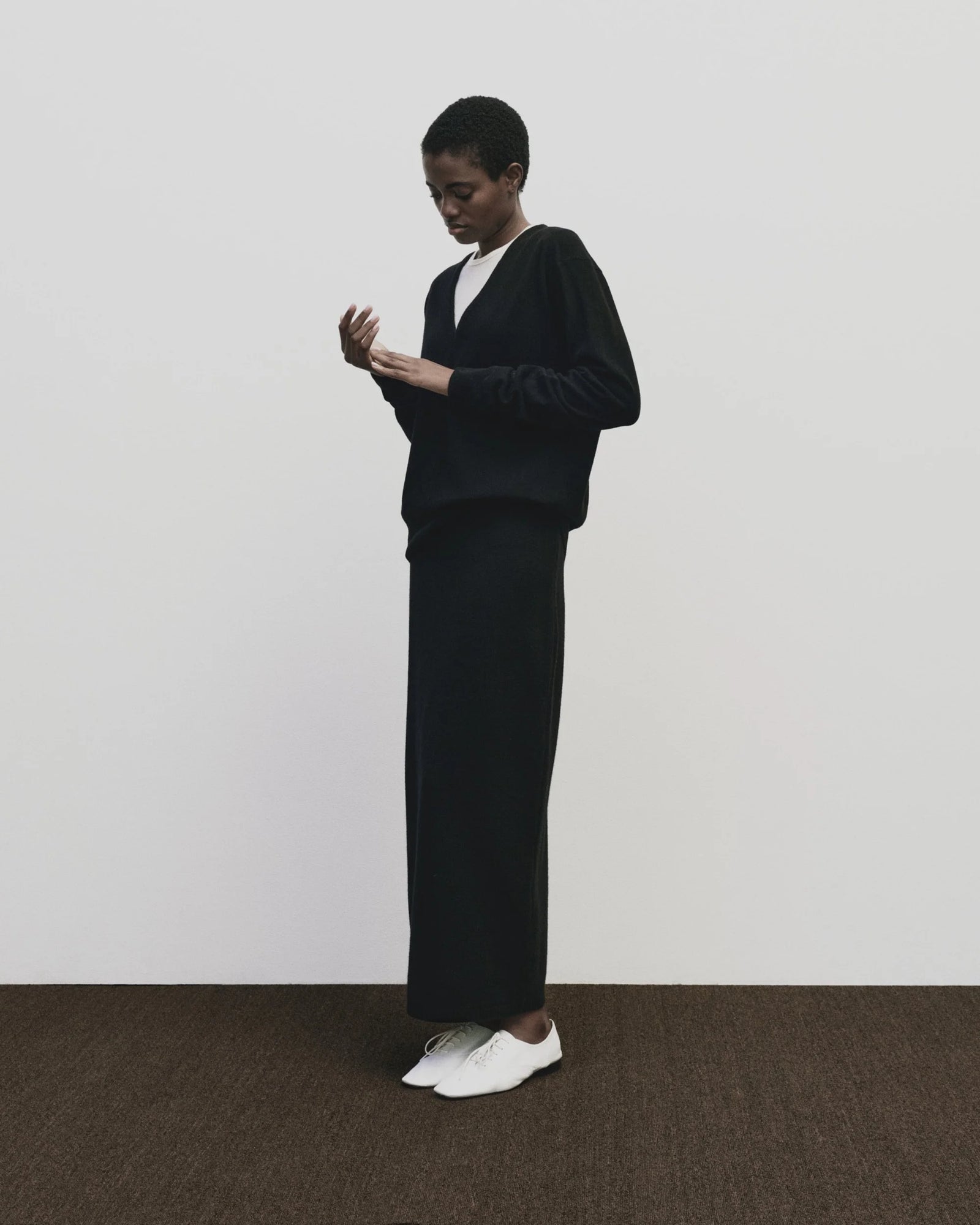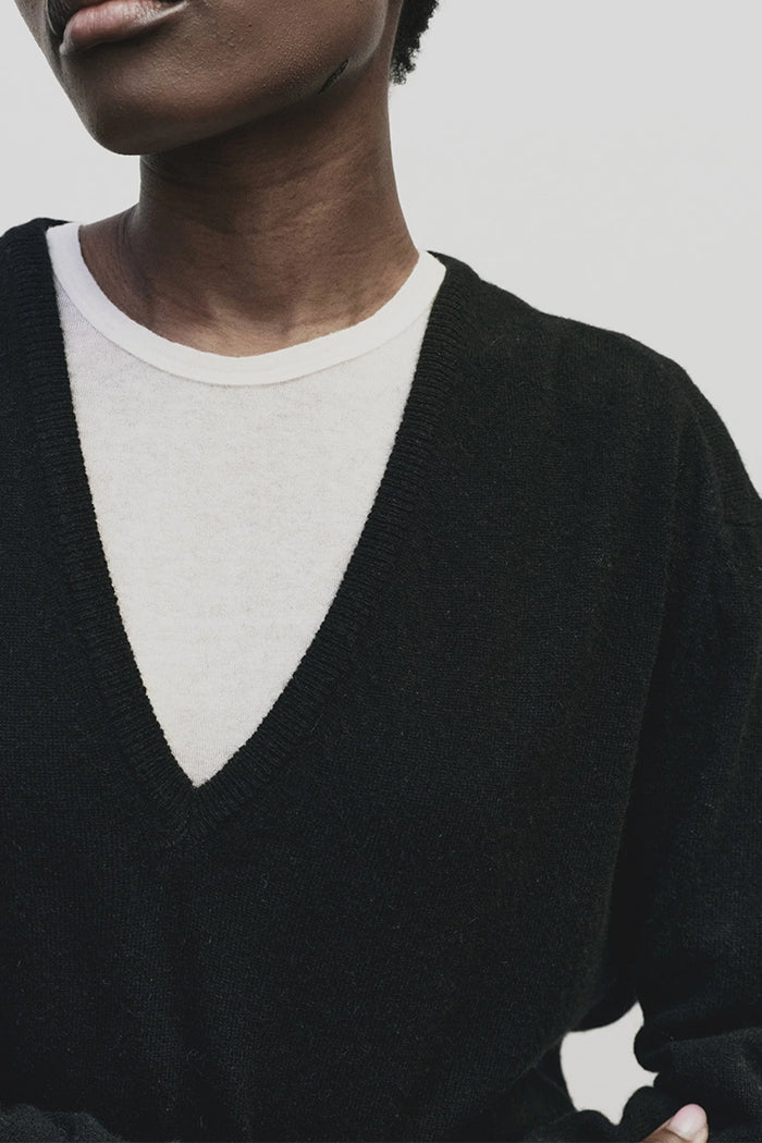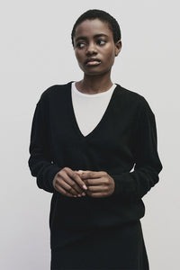 Mijeong Park relaxed fit cashmere v-neck knit sweater in black. Mid-weight merino wool and cashmere blend knit. Rib trim at cuffs and hem.