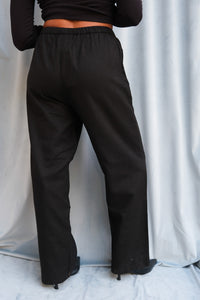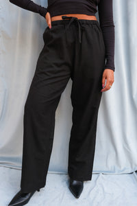 Na Nin drawstring Dimitri woven easy silk pant in black. Elastic waistband, convenient side pockets, and a comfortable, spacious leg.