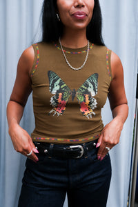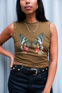 Tyler Mcgillivary khaki green collector classic tank with butterfly shadow box print, and colorful thread edge detail.
