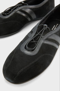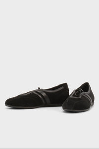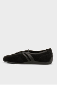 Vagabond Hollie flat sneaker in black. The Hollie draws inspiration from racing design, resulting in a streamlined silhouette with a soft and flexible construction. The style combines sneaker design with a ballet flat silhouette, crafted from black suede.