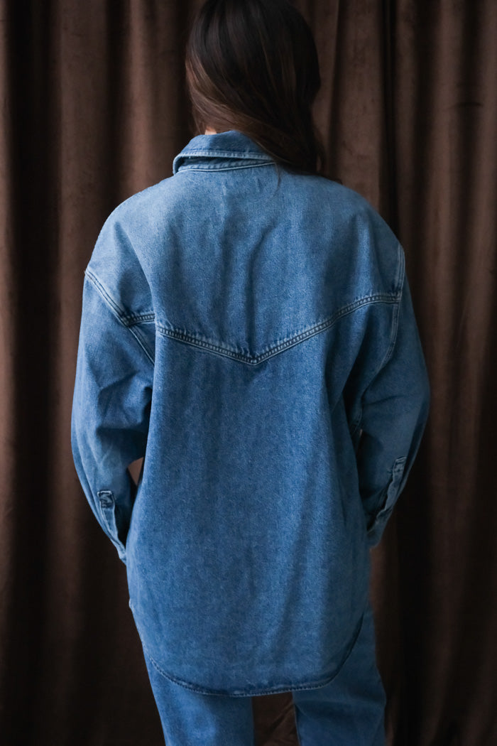Agolde Lotta oversize denim shirt in medium indigo in Grade wash. The Lotta shirt features exaggerated pockets on the chest. Elongated long sleeves, and a relaxed, yet not-too-oversized, perfectly slouchy silhouette. Weightless regenerative cotton with an authentic vintage hand.