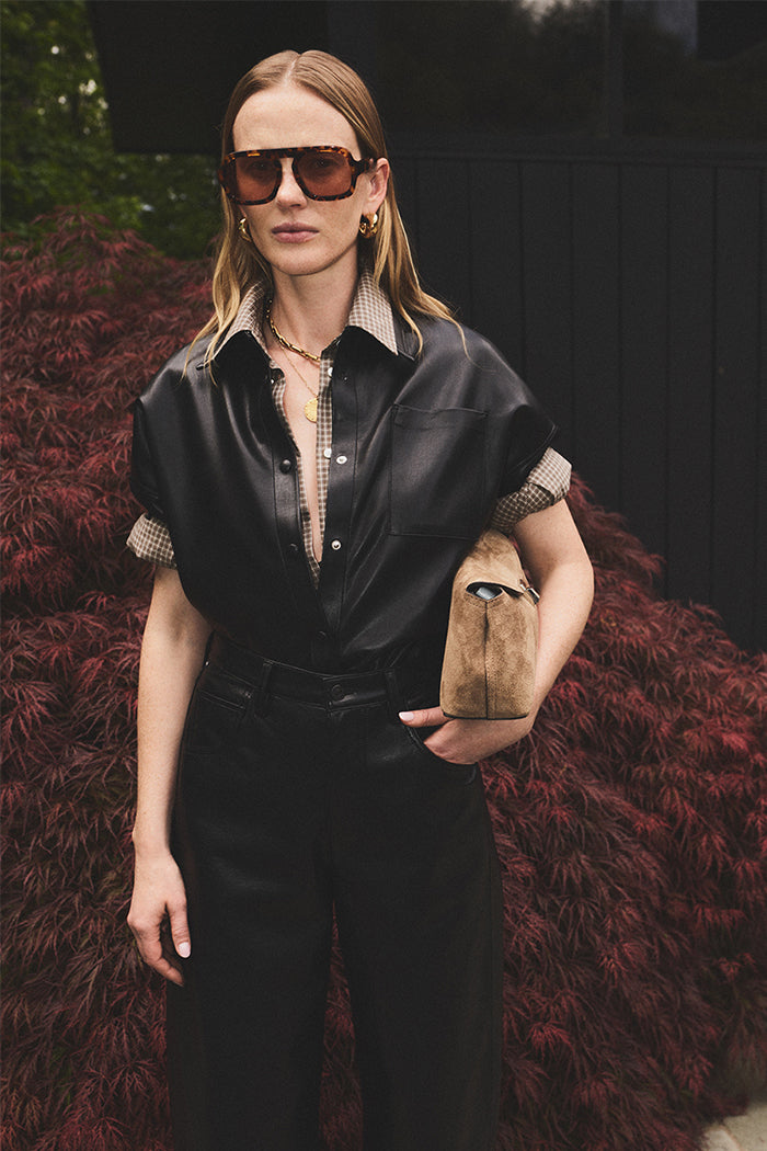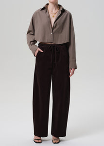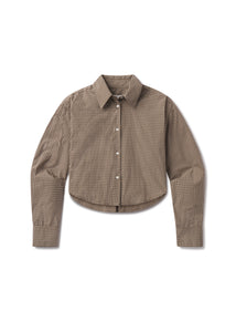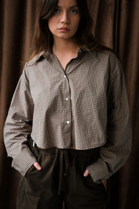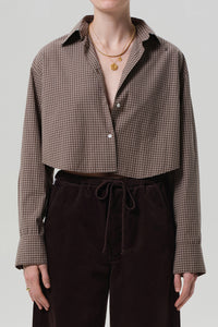 Citizens of Hummanity Ana cropped button up shirt in dark brown and grey micro heritage plaid. A modern staple with a vintage nod, the Ana shirt is cut from ultra-lightweight Japanese cotton with an airy feel. The cropped silhouette and pointed collar lend sharp structure, while the dark brown and grey micro plaid adds subtle depth.