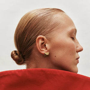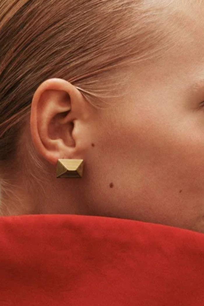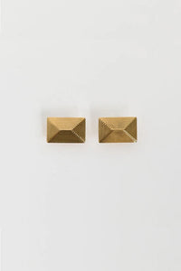 Heaven Mayhem Celeste Earrings in gold embody the elegance of Art Deco jewelry, inspired by the geometric patterns and architectural details found in vintage interiors. Their ridged rectangular design evokes the timeless sophistication of sculpted metalwork — reminiscent of ornate door handles and classic European craftsmanship.
