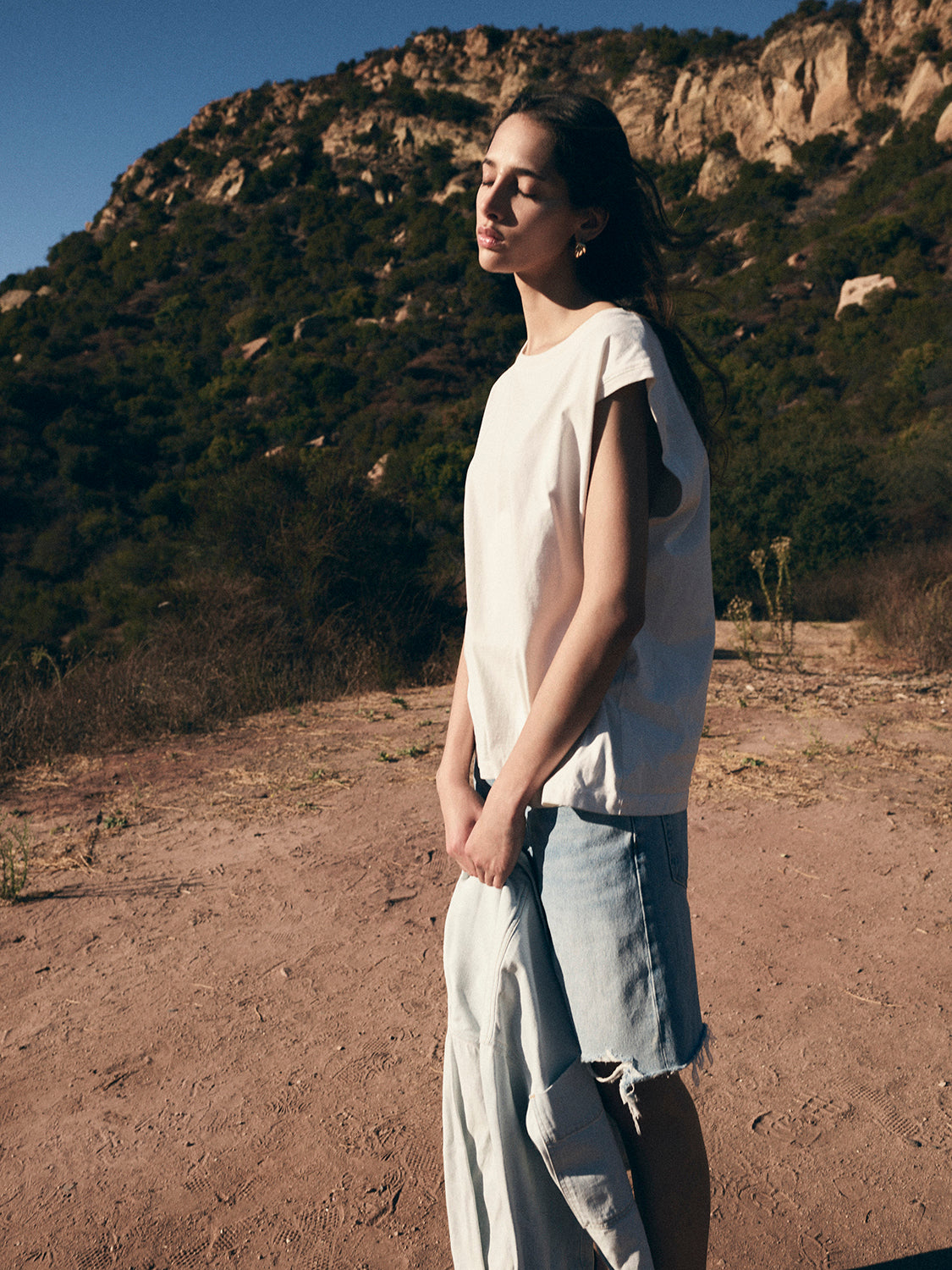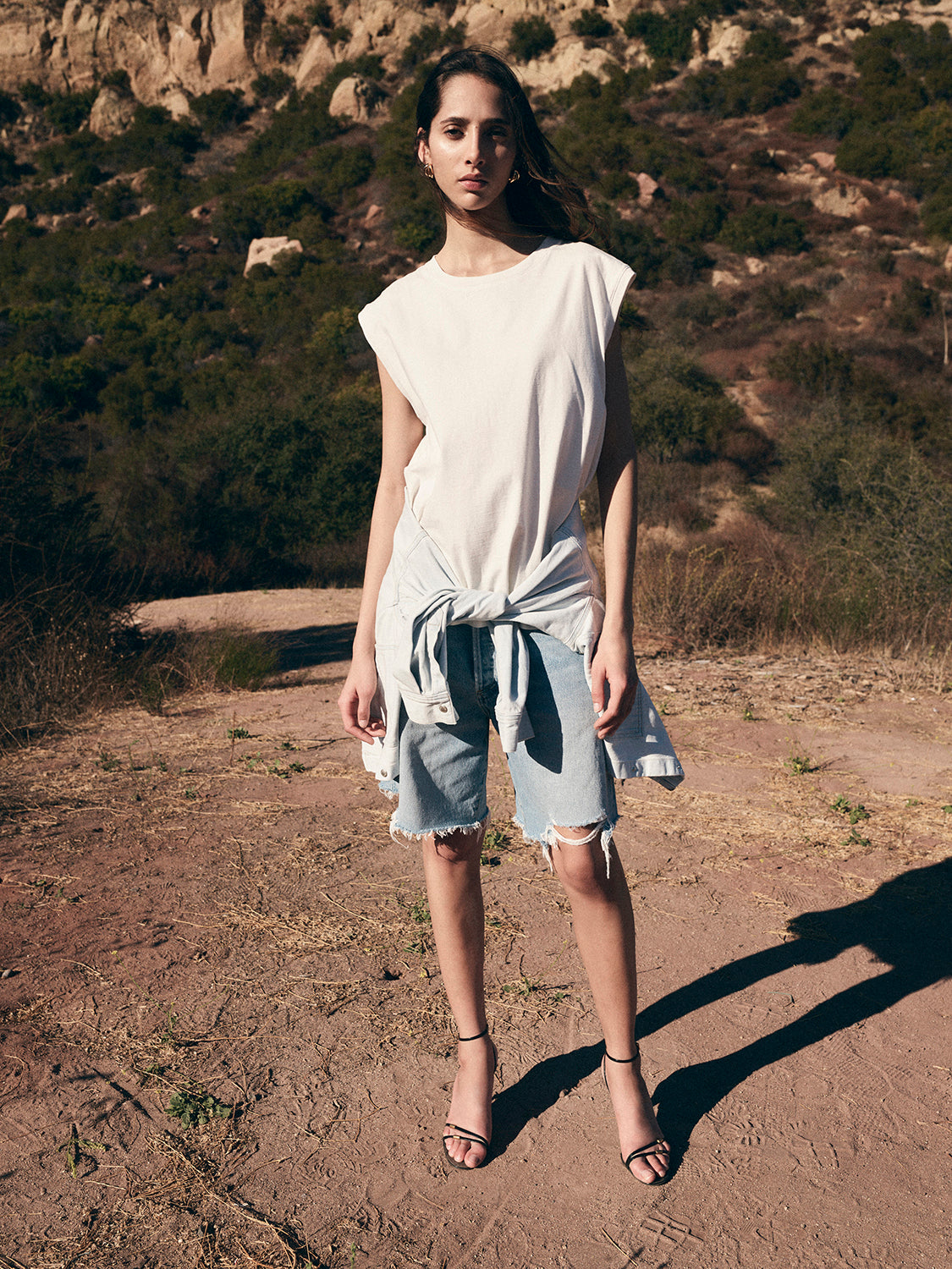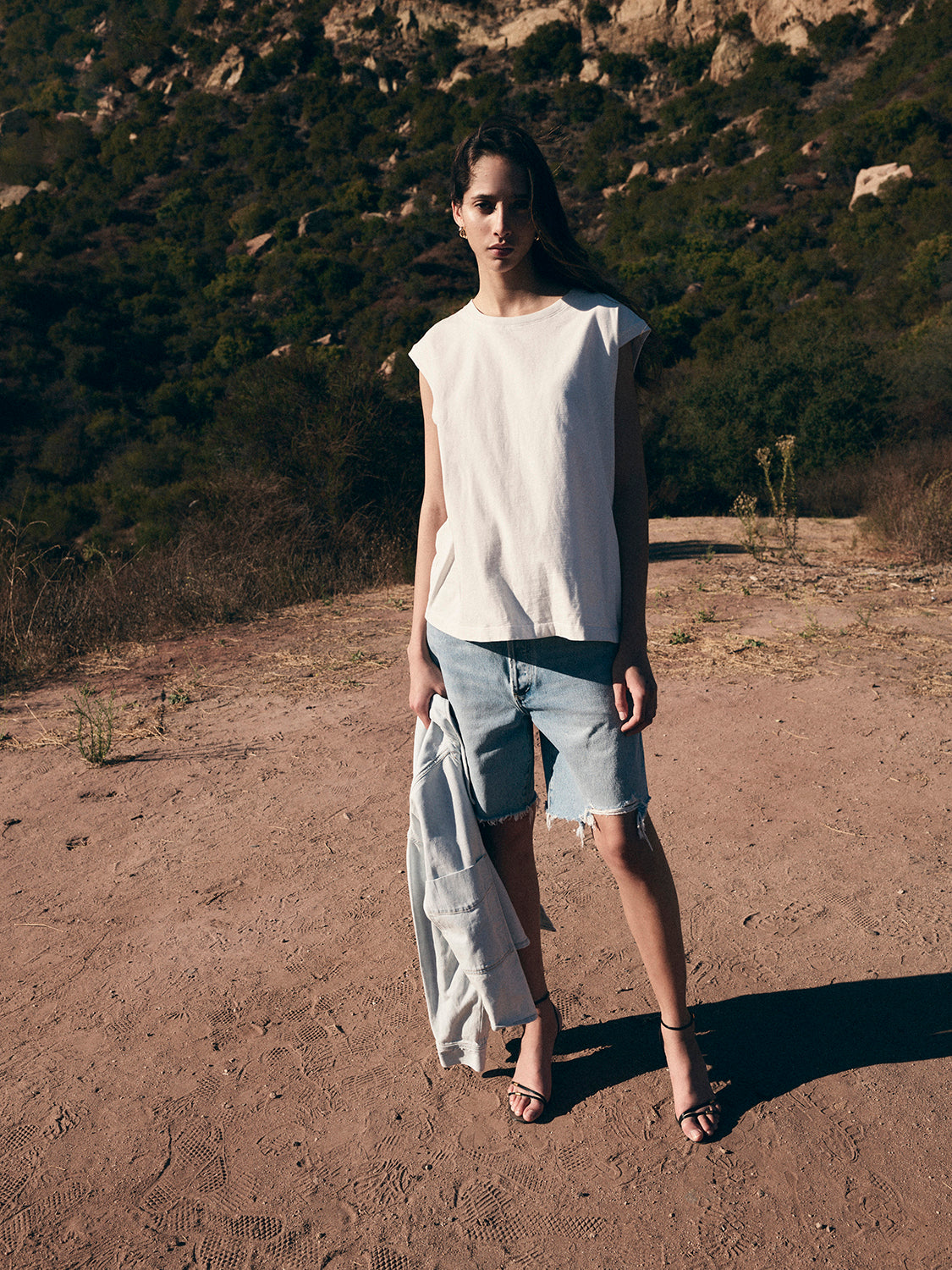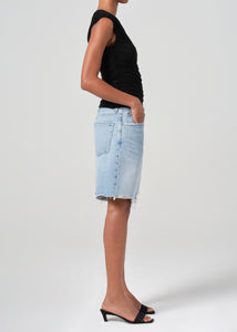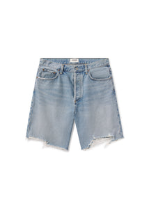 Agolde Indra hip slung shorts in light denim force wash with some distressing. Featuring a square top block and offering Agolde’s most relaxed and eased-up fit for effortless style.
