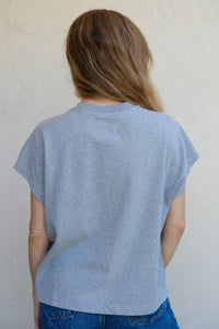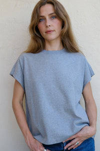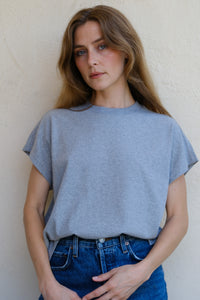Le Bon Shoppe heavyweight 100% cotton urban muscle Jeanne tee in heather grey. This tee is garment dyed and pre-washed for a rich textured look with an ultra soft feel and a shorter length to pair perfectly with high waisted bottoms.