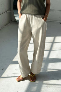 Le Bon shoppe elastic waist Arc pants in naturel cream canvas. Slightly curved and cropped leg, unique side panels, and deep pockets. An elasticated, high waist that allows for effortless movement and accessibility. The heavy-weight canvas adds durability and gives a structured look. They're the perfect everyday pants, made easy to style.