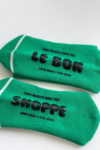 Le Bon Shoppe hugger sock in kelly green. Built on the same classic crew-length base as the Boyfriend Socks, with a clean, solid leg and a playful surprise underneath. A silicone motif on the sole adds a light grip, perfect for hugging flats, clogs, and slides.