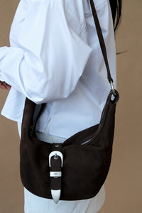 MARGESHERWOOD belted hobo mini bag in brown hush nubuck suede. This slouchy bag can be worn crossbody or on the shoulder. Adjustable strap, and zip closure.