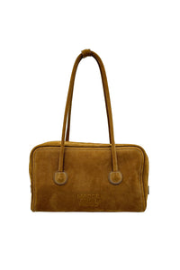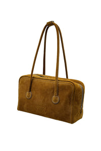 Margesherwood rectangular soft Boston bag in chestnut warm brown nubuck. Two way zipper, white contrast stitching, and embossed logo.