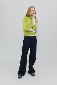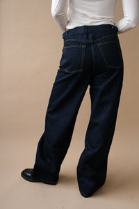 Still Here Buckle jean in dark indigo. A relaxed leg, subtle drop-crotch with a 31" inseam. Features custom chrome buckle hardware and adjustable waistband side fasteners, allowing it to be worn as both a mid or low-rise jean. Complete with a classic zipper fly and signature 'SH' embroidery.