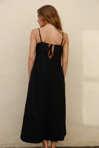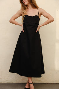 Toit Volant black Verona dress with a sweetheart neckline and bandeau bust detail. Convenient side pockets and adjustable spaghetti straps.