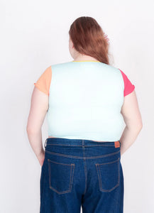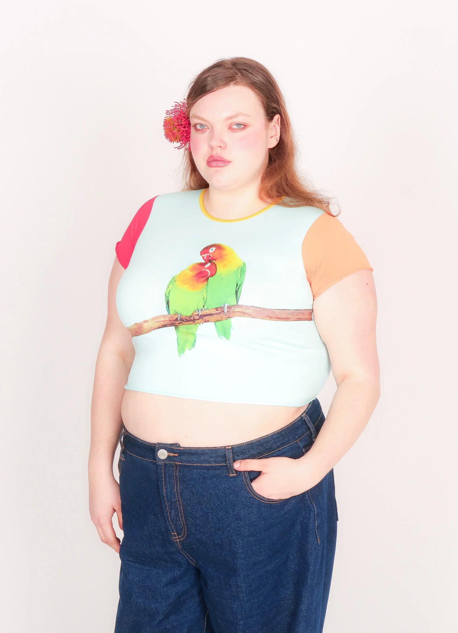 Tyler Mcgillivary Lovebird Tee is a stretchy cotton baby tee with mismatched orange color blocked sleeves, yellow trim, and two perfect lovebirds printed center front.