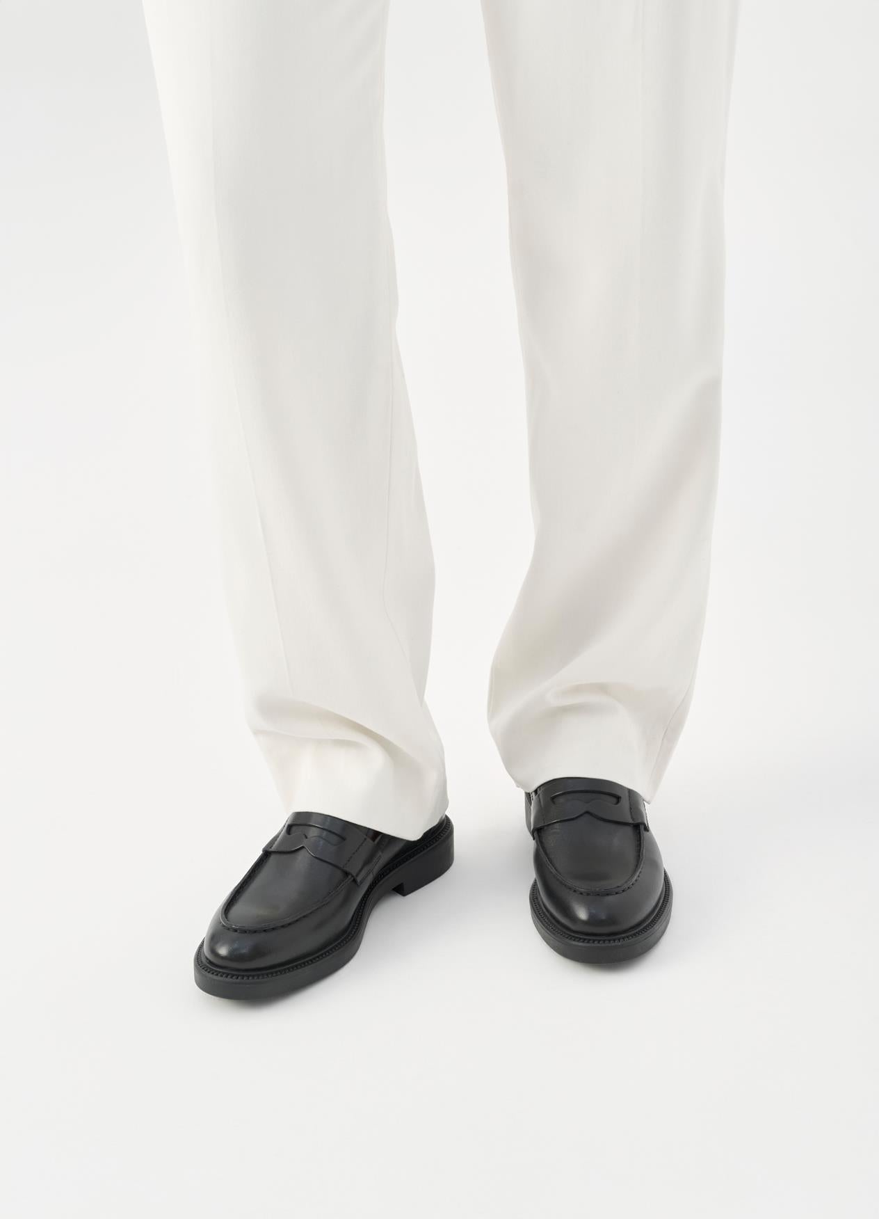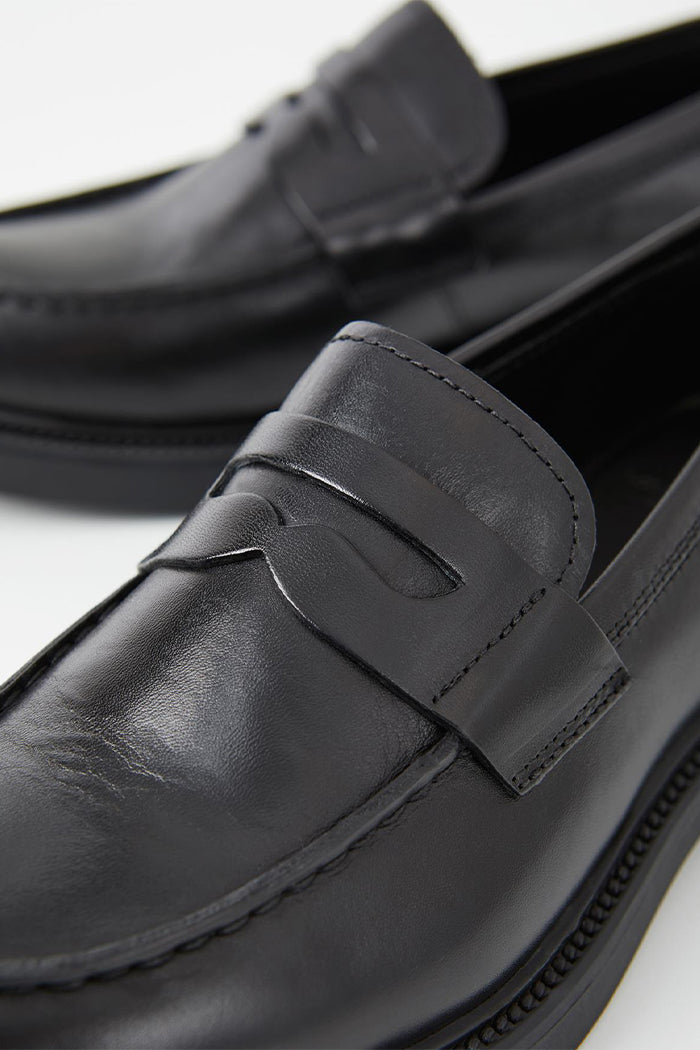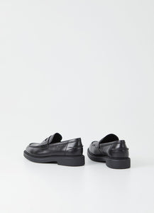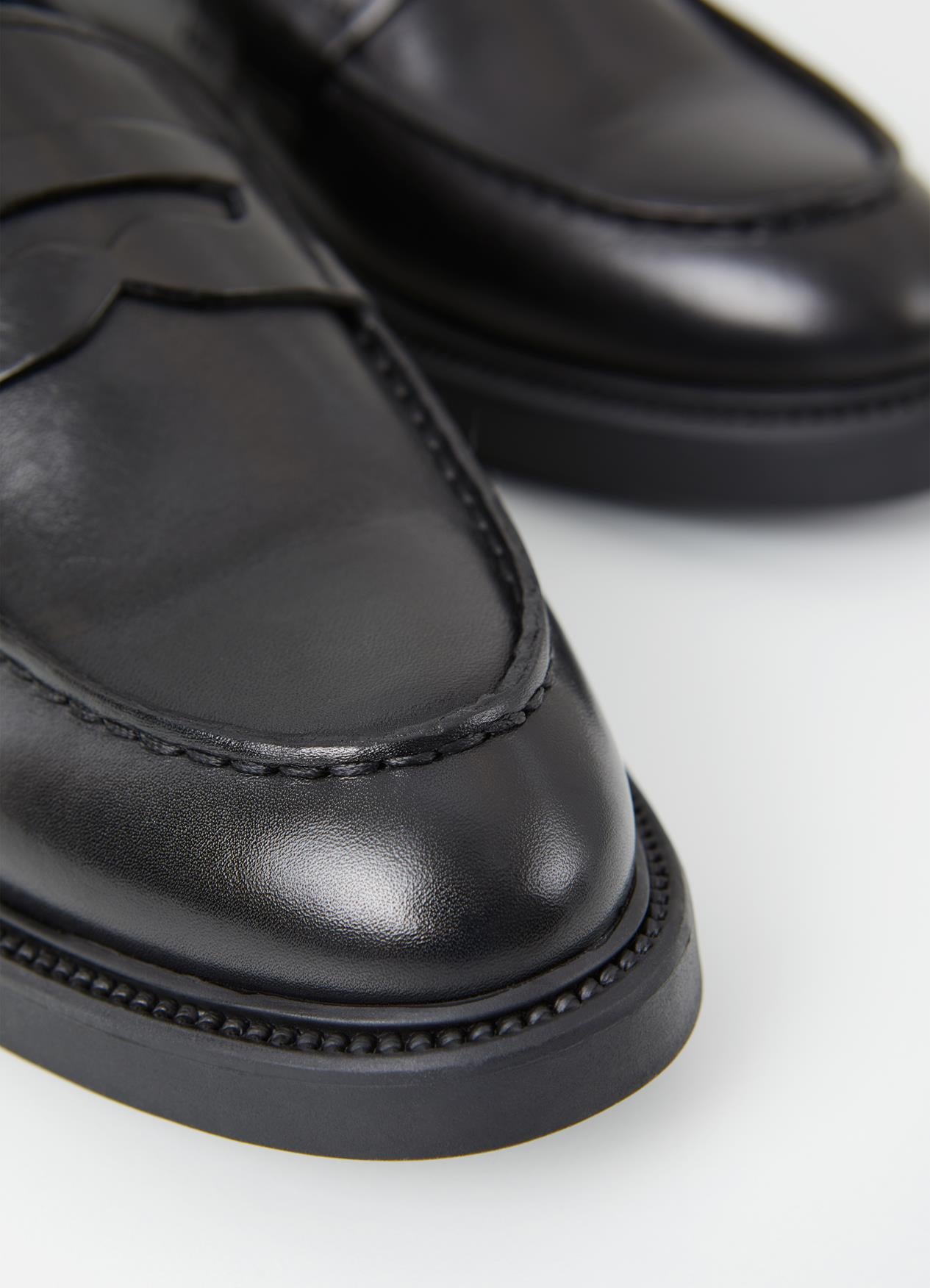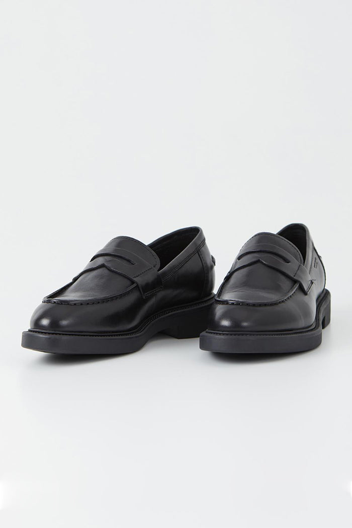 Vagabond Alex W smooth black leather penny loafer. Featuring moc toe detailing, almond toe shape is accompanied by a traditional penny slot across the vamp.